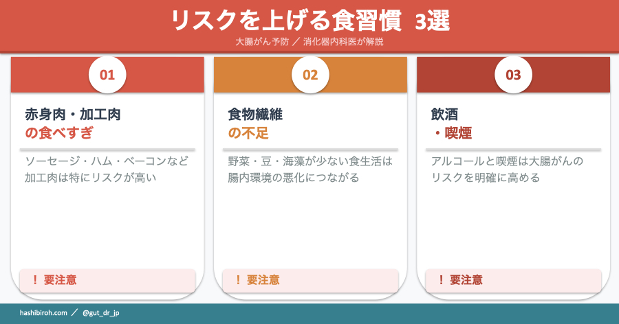 大腸がんは、生活習慣と深く関係しています。特に食事の影響は大きく、以下の習慣がリスクを高めることがわかっています。