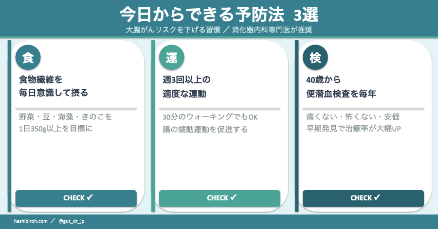 大腸がんは怖いがんですが、早期発見できればほぼ治せるがんでもあります。生活習慣の見直しと定期検診、この2つが最強の予防策です。